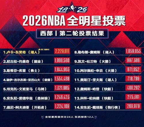 北京时间1月7日,NBA官方公布了2026年NBA全明星第二轮球迷投票结果,洛杉矶湖人后卫卢卡·东契奇与密尔沃基雄鹿...