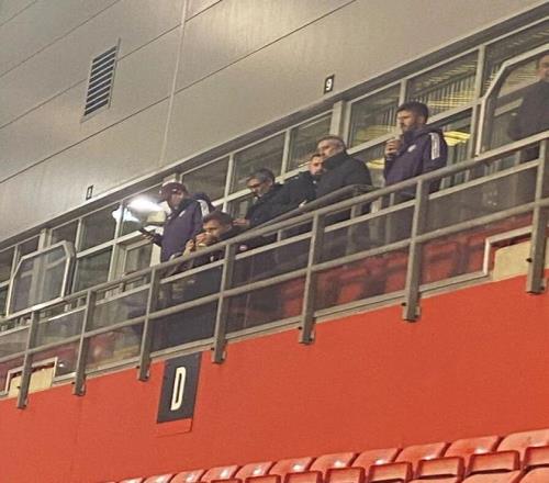 卡里克手捧咖啡,与曼联体育总监贾森·威尔考克斯、U18青年队主教练达伦·弗莱彻以及一线队教练组史蒂夫·霍兰德、乔纳森·伍德盖特和乔尼·埃文斯一起出现在看台上。